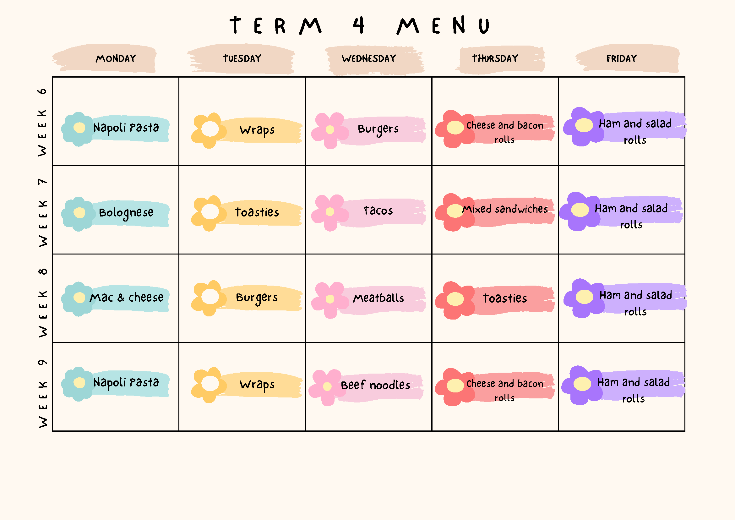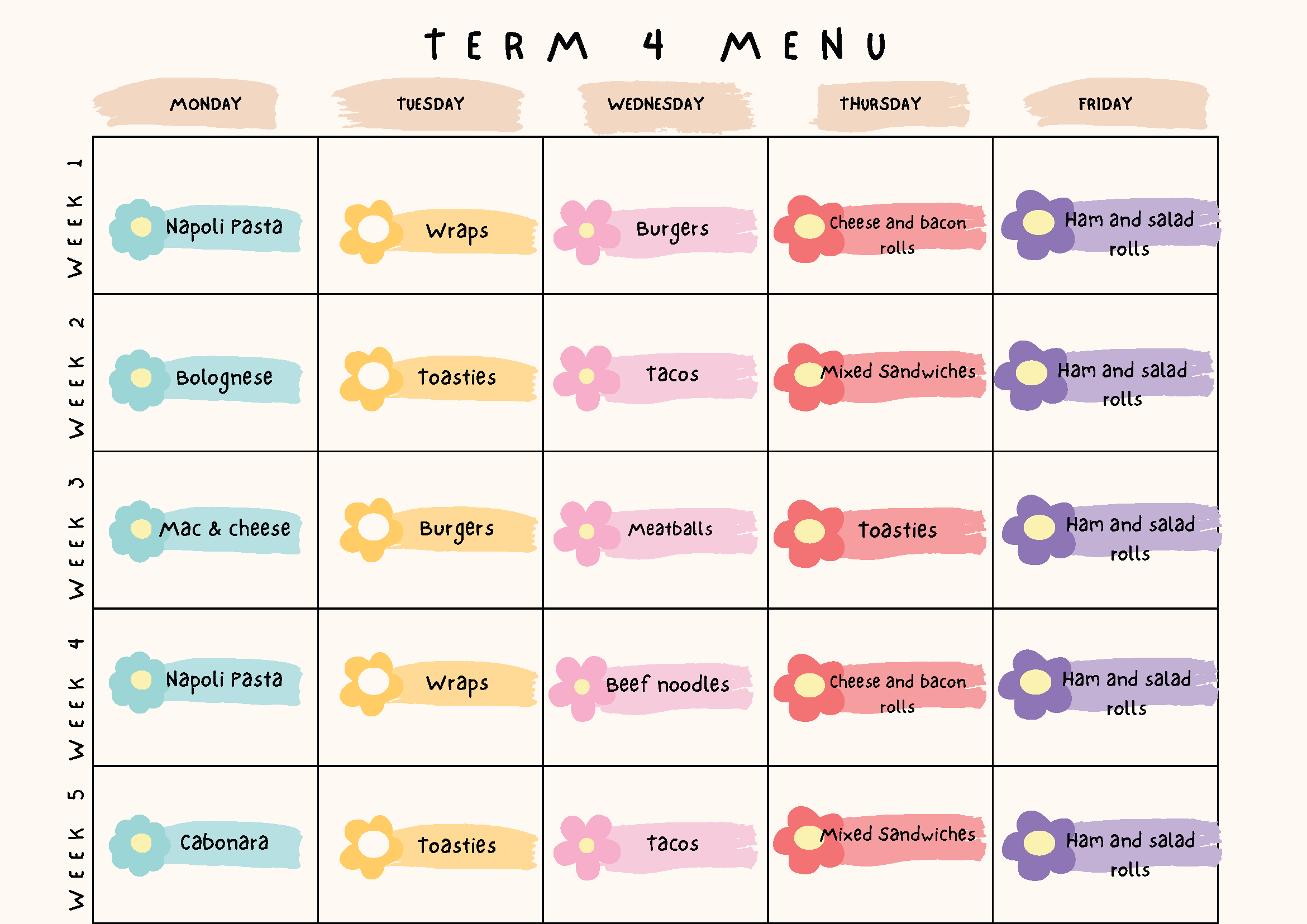 We proudly provide every child every day with a free, fresh, nutritionally balanced lunch. See our Term 4 menu below, which alternates every week. Students also receive free fruit for fruit break and afternoon an snack.