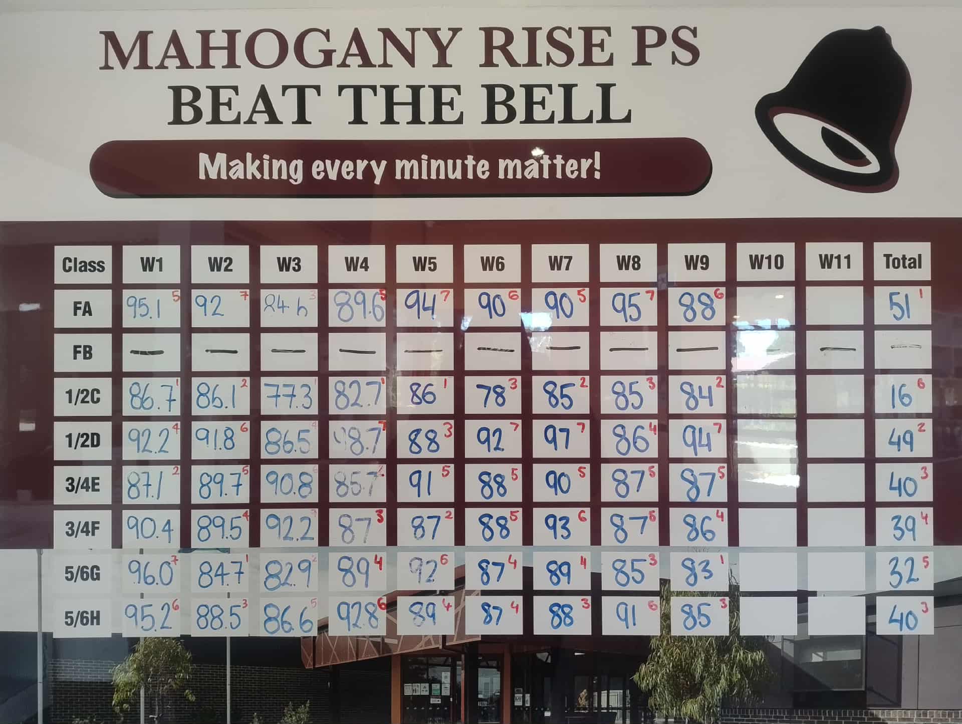 Each day, classes record how many students arrive before the bell. These results are tallied at the end of the week and turned into a class attendance percentage. At the end of each term, the class with the highest on-time attendance wins a special class day out!