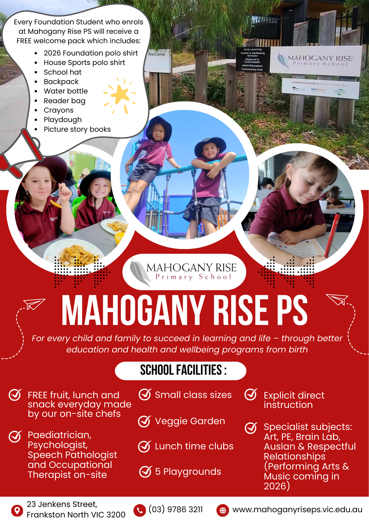 You will be able to apply to enrol your child in Foundation (Prep) 2026 at Mahogany Rise Primary School from April 2026.